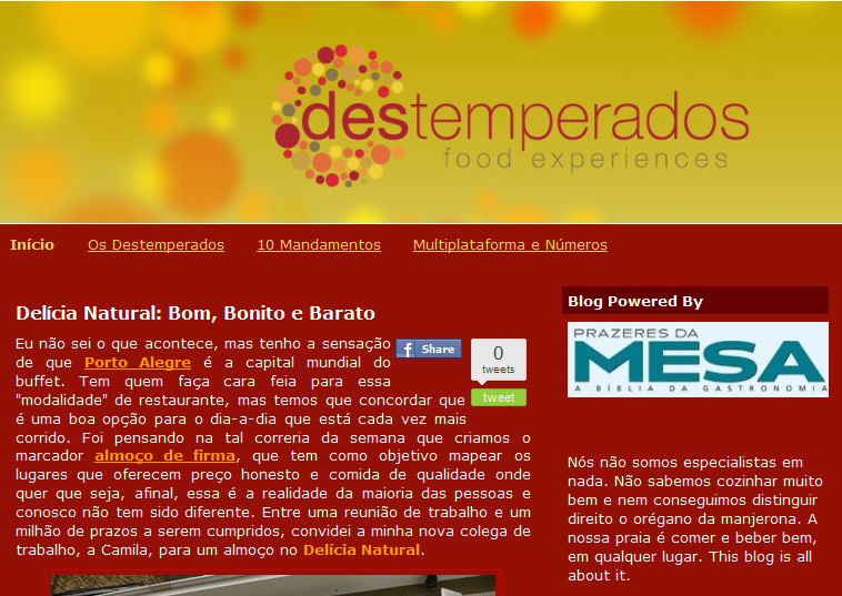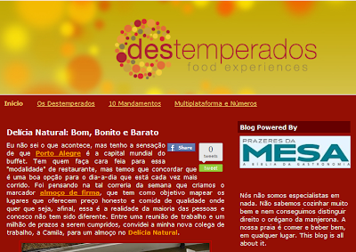 Mais uma viagem sendo programada e dessa vez resolvi investir nos restaurantes. Não investir milhares de reais, mas pesquisar lugares legais, testados e aprovados por outras pessoas. E pra esse tipo de busca, nada melhor do que o Destemperados. O blog reúne centenas de dicas de restaurantes em várias cidades (sobretudo nas regiões sul e sudeste e em alguns outros países), sempre com mutias fotos do ambinete e de opções de cardápio e, ao final, sempre diz o preço pago pela comilança. Ainda dá o endereço completinho do lugar (sim, tem muitos blogs que não colocam o endereço!). Enfim, fica aí a dica pra parte gastronômica das nossas aventuras.
