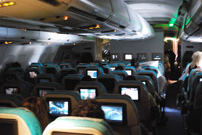 O serviço de bordo é realmente bom. O pessoal é simpático e prestativo e não fica de cara ficou de cara feia quando pedi trezentos copos de água durante o voo. Mas acho que o diferencial da empresa é mesmo as refeições e o material fornecido aos passageiros. Além travesseiro e da coberta, a companhia oferece aos passageiros uma necessaire bonitinha (super utilizável depois) com escova de dentes, meia, protetor de olhos e ouvidos e até um lip balm! Achei sensacional. Outro diferencial é que, nos voos longos, depois de servir a primeira refeição eles distribuem uma garrafa de água para cada pessoa. Isso é ótimo porque o ambiente seco do avião realmente faz a gente precisar de muita água e nada mais chato do que ter que chamar os comissários de bordo toda hora.