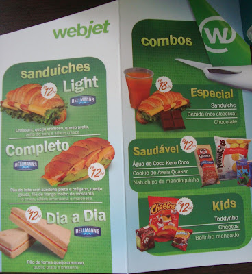 A pioneira no Brasil nessa prática é a Webjet que passou a não distribuir mais lanches e apenas vendê-los no trecho Salvador-São Paulo, em caratér experimental. Seguem abaixo fotos do cardápio para que vocês conheçam as opções e preços oferecidos pela empresa.