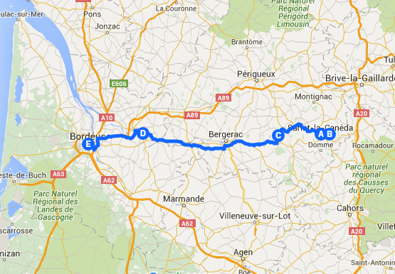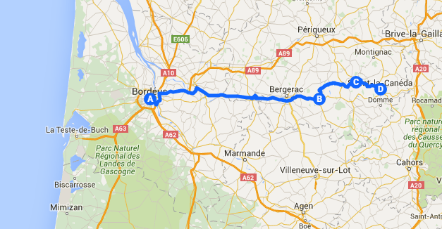 Saímos de Bordeaux (A) pela manhã e fomos direto até Lalinde (B). Era um belo sábado de verão e encontramos a cidade toda colorida, com um mercado de produtos locais. Essa cidade é super charmosa e o local do seu antigo mercado central foi ocupado com restaurantes simpáticos, onde almoçamos. Dali seguimos para Les Eysies-de-Tayac (C), onde visitamos o sítio troglodita da Roque Saint Christophe e o Museu da Pré-história e do Homem de Cro-Magnon. Eu gostaria de ter tido mais tempo aqui para vistar a gruta Lascaux. Então seguimos para Sarlat-la-Canéda (D), onde ficamos hospedamos. Essa charmosa cidade foi nossa base para explorar a região. Todo o percurso, de Bordeaux a Sarlat, tem um pouco mais de 140km.
