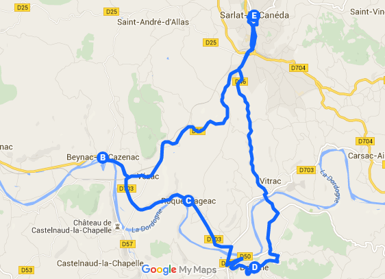 No dia seguinte, saímos de Sarlat (A) e fizemos um roteiro entre 3 lindíssimas cidades: Beynac-et-Cazenac (B), uma maravilhosa vila medieval muito bem preservada e com um castelo que vale ser visitado; Roque-Gageac (C) que tem um relevo impressionante e uma paisagem incrível; e Domme (D) que é a perfeita finalização de dia no alto de uma rocha imensa, de onde se vê toda a região. Depois retornamos a Sarlat (E) para jantar e pernoitar. Todas estas cidades estão a poucos kilômetros (entre 10km e 20km) de distância, o que torna este roteiro possível.