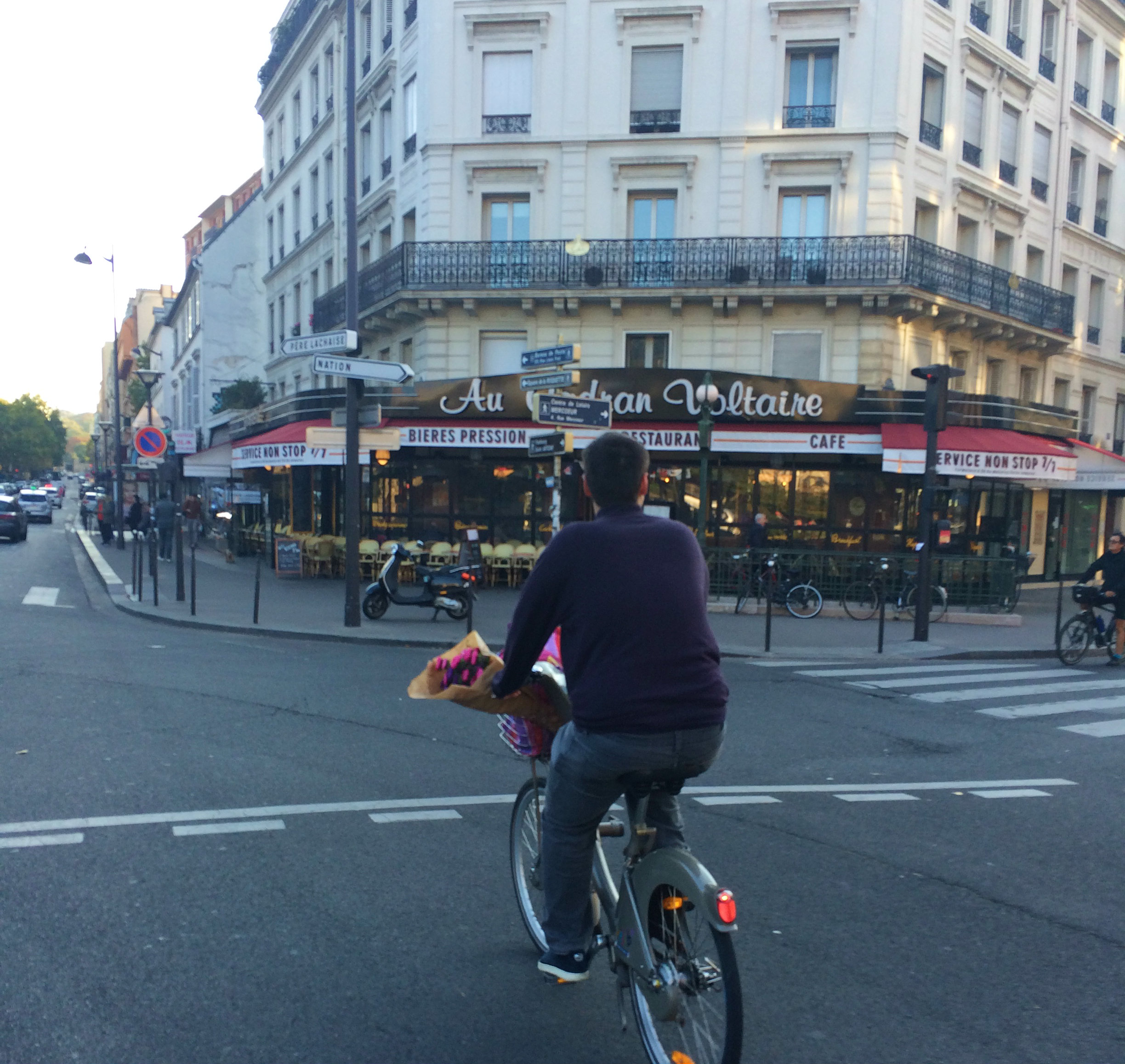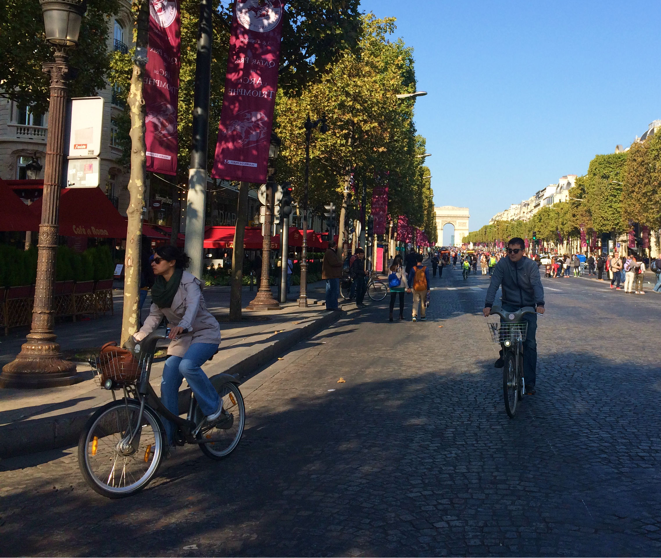 Os motoristas parisienses, em geral, são bastante respeitosos com os ciclistas: não buzinam para apressa-los, não fazem ultrapassagens arriscadas, mantém uma distância segura. Isso, é claro, como uma generalização, o que não quer dizer que não haja motoristas agressivos, impacientes, mal educados.